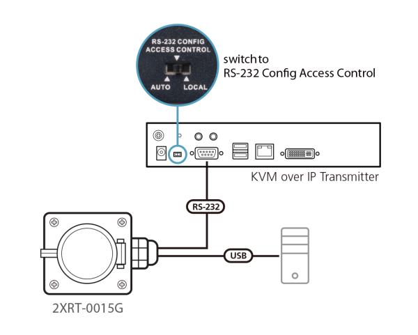 3. Connect the RS-232 connector of the 2XRT-0015G to the RS-232 Port of the KVM over IP Transmitter and connect the USB connector of the 2XRT-0015G to a computer for USB bus-power supply.