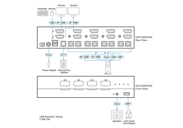 - 1x CS1144DPH4C 4-Port USB 5K DisplayPort/HDMI Dual Display Universal Secure KVM Switch with CAC