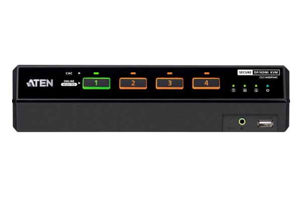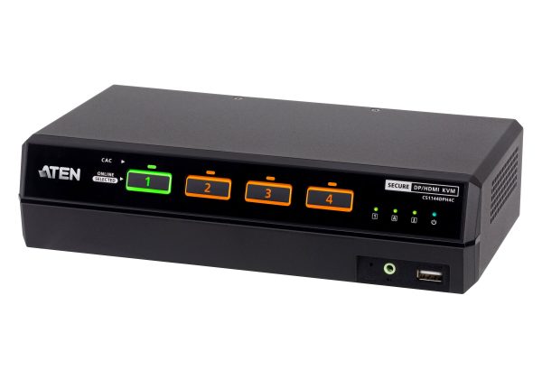 ATEN PSD PP v4.0 Universal Secure KVM Switch CS1144DPH4C provides isolation between computer sources and peripherals while sharing a single keyboard, mouse, monitor, speaker set, and Common Access Card (CAC) reader between connected computers of various security classifications. Compliance with PSD PP v4.0 ensures peripheral sharing capabilities provide maximum user data security when switching port focus, preventing unauthorized data flows or leakage between connected sources. Key protections include isolation and unidirectional data flow, restricted peripheral connectivity and filtering, user data protection, configurable device filtration and management, strict audio filtration, and always-on tamper-proof design, keeping sensitive assets isolated and providing advanced security and a user friendly design for instantly secure deployment.