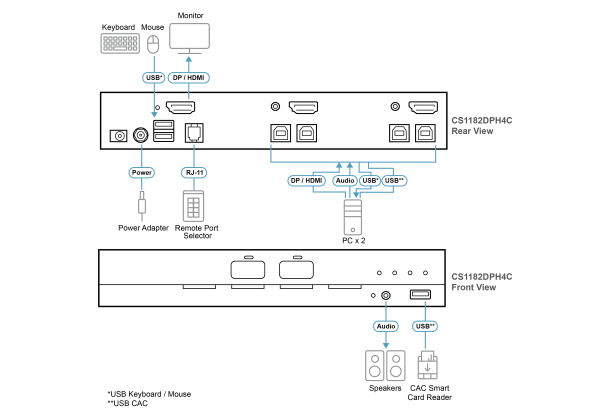 - 1x CS1182DPH4C 2-Port USB 5K DisplayPort/HDMI Universal Secure KVM Switch with CAC