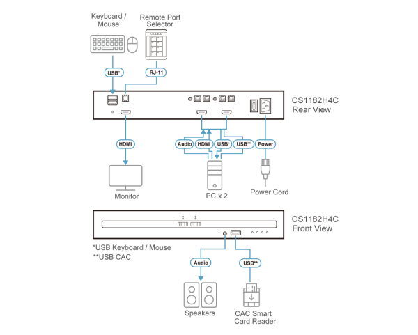 - 1x CS1182H4C 2-Port USB HDMI Secure KVM Switch with CAC