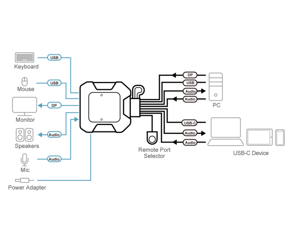- One KVM console controls one USB DisplayPort computers and one USB-C device
