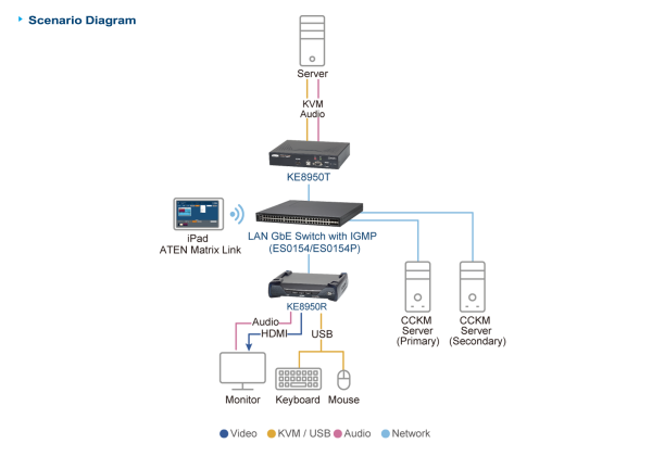 Implementing the KVM over IP Matrix Manager (CCKM) with KE8950, IT administrators receive advanced features functioning as auto detection of all KE Series Extenders* on the same subnet for the sake of fast installation or configuration, username/password authentication and authorization, and the ability to define different types of connections that can be switched and shared. Security features also provide extra protection, supporting AES encryption for secured data transmissions, while RADIUS, LDAP, AD or remote user authentication provides an added layer of connection security; moreover, with an OSD, RS-232 support, and Auto MDIX, the KE series is the most cost-effective and convenient way to get a full digital extension from anywhere on the intranet.