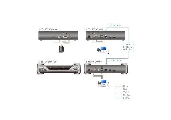 The 4K HDMI KVM over IP Extender consists of a Transmitter unit that connects to the computer and a Receiver unit that provides console access from a separate location. The computer is accessed from the remote console over a standard TCP/IP network via Cat 5e/6 cable that allows point-to-point, point-to-multipoint, multipoint-to-point , and multipoint-to-multipoint administration. KE8950 can be connected either directly to each other or via a high-speed network, over a copper-based or fiber-based LAN.
