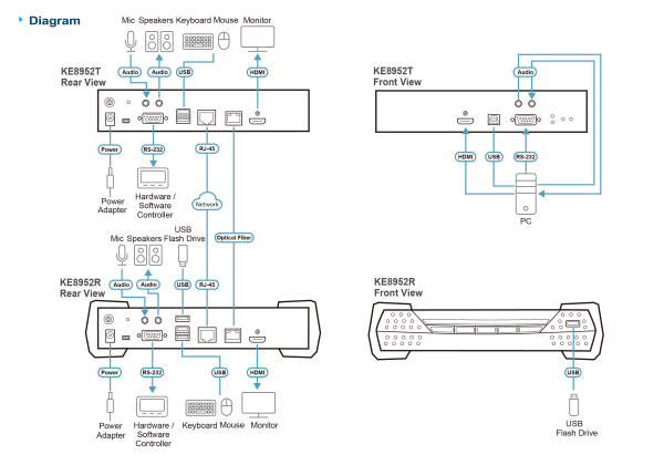 The 4K HDMI KVM over IP Extender consists of a Transmitter unit that connects to the computer and a Receiver unit that provides console access from a separate location. The computer is accessed from the remote console over a standard TCP/IP network via Cat 5e/6 cable that allows point-to-point, point-to-multipoint, multipoint-topoint, and multipoint-to-multipoint administration. KE8952 can be connected either directly to each other or via a high-speed network, over a copper-based or fiber-based LAN.