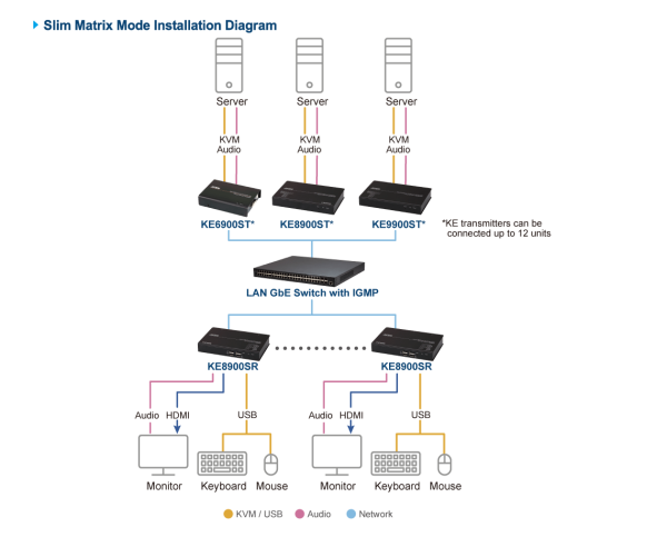 When working without the CCKM centralized management, the KVM over IP extender features the Slim Matrix Mode that makes up to 12 units of KE6900ST / KE8900ST / KE9900ST connect with unlimited Rx units. It means up to 12 IPs can be used to set transmitters.