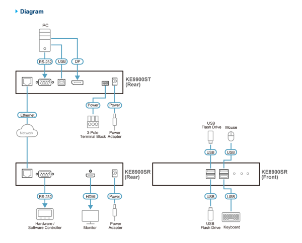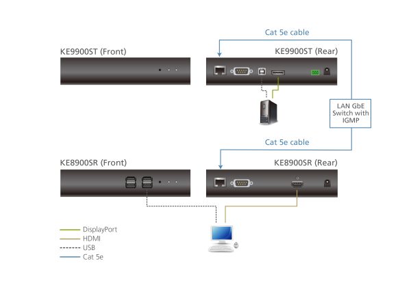 The KE9900ST supports DisplayPort video input from the computer. The transmitter provides video resolutions up to 1920 x 1200 @ 60 Hz and offer flawless and visually lossless video quality with low latency. The extender also supports Virtual Media function and RS-232 serial commands. In addition to a DC power jack, the KE9900ST transmitter includes an extra DC terminal block for convenient installation.