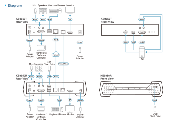 • 1x KE9950T 4K DisplayPort Single Display KVM over IP Transmitter