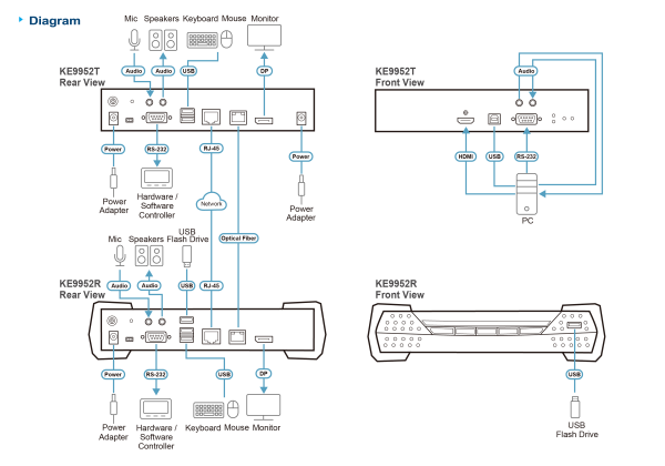 The KE9952 4K DisplayPort Single Display KVM over IP Extender consists of a high performance IP-based transmitter KE9952T that connects to the computer and receiver KE9952R that provides console access from a separate location. The KE9952 allows access to a computer system from a remote USB console (USB keyboard, USB mouse, DisplayPort monitor) over an intranet, enabling users to locate computers in a secure and temperature controlled environment, which is isolated from users’ workstation.
