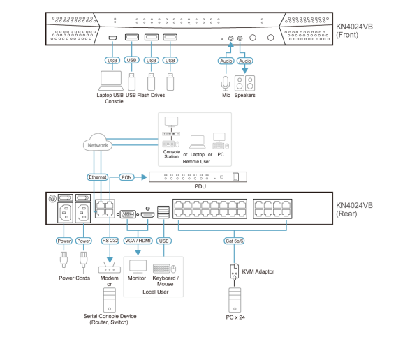 The KN series is compatible with ATEN’s KVM over IP Console Station – the KA82 series. The KA82 series is a standalone console that replaces PC or NB, enabling users to remotely access, monitor and control all servers connected to multiple ATEN’s KN series with impenetrable security against virus threats. It is especially suitable for environments where a PC is not allowed. In addition, the KN series works with ATEN’s PDU remote power management systems from the KVM over IP switches’ user interface.